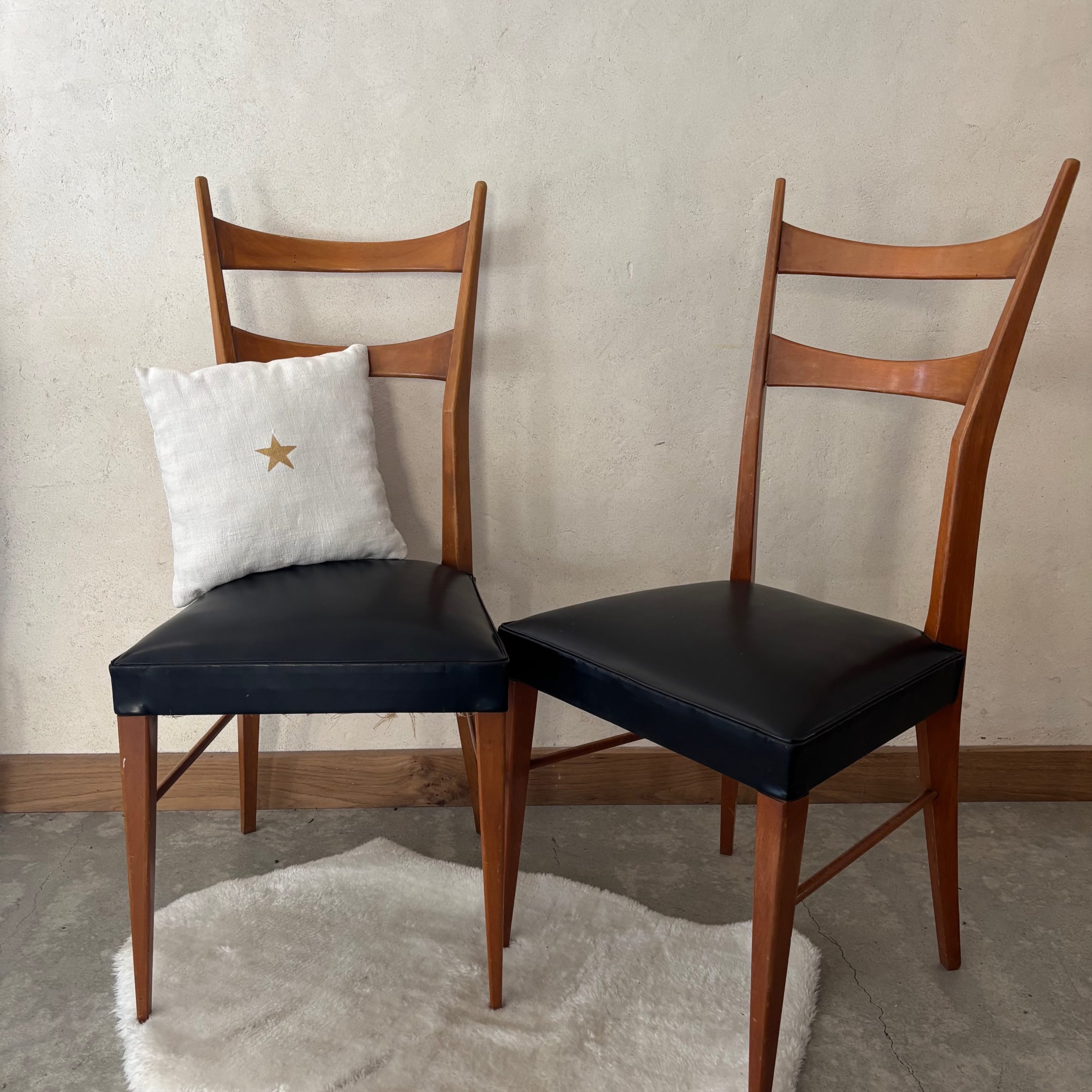 Fabrication italienne des années 1960. Structures entièrement en hêtre. Assises en simili-cuir noir.